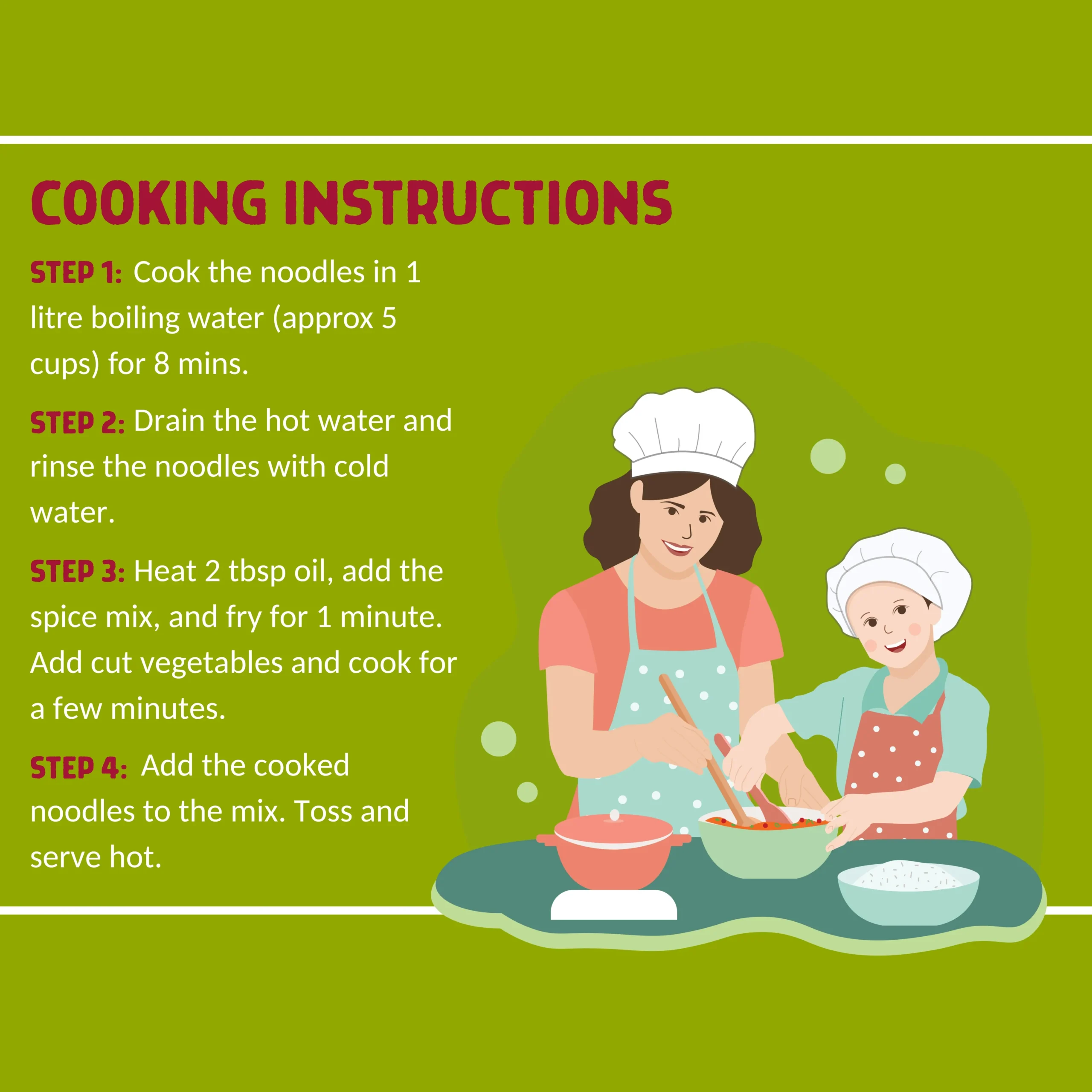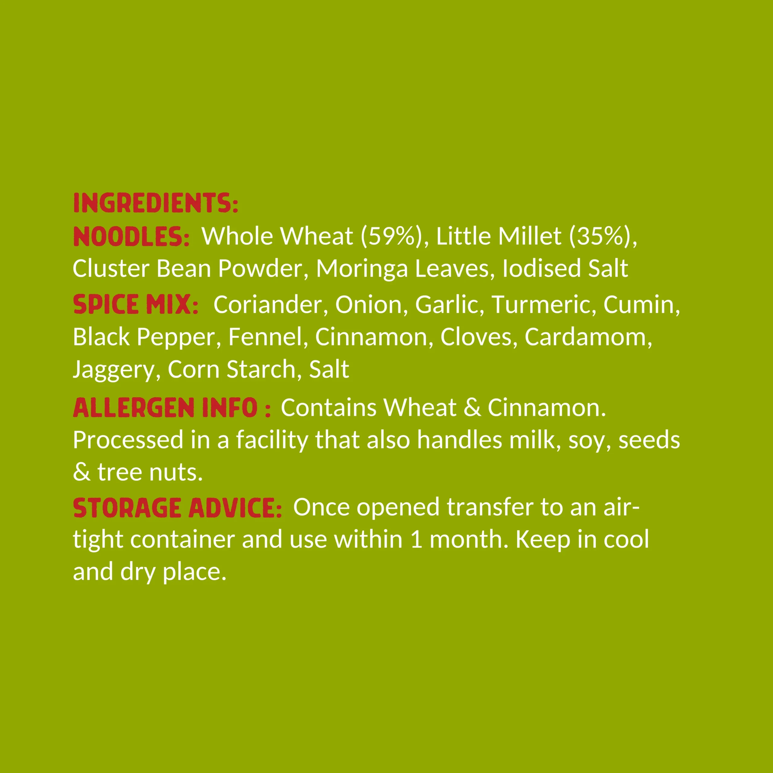 NOODLES: Whole Wheat (59%), Little Millet (35%), Cluster Bean Powder, Moringa Leaves, lodised Salt