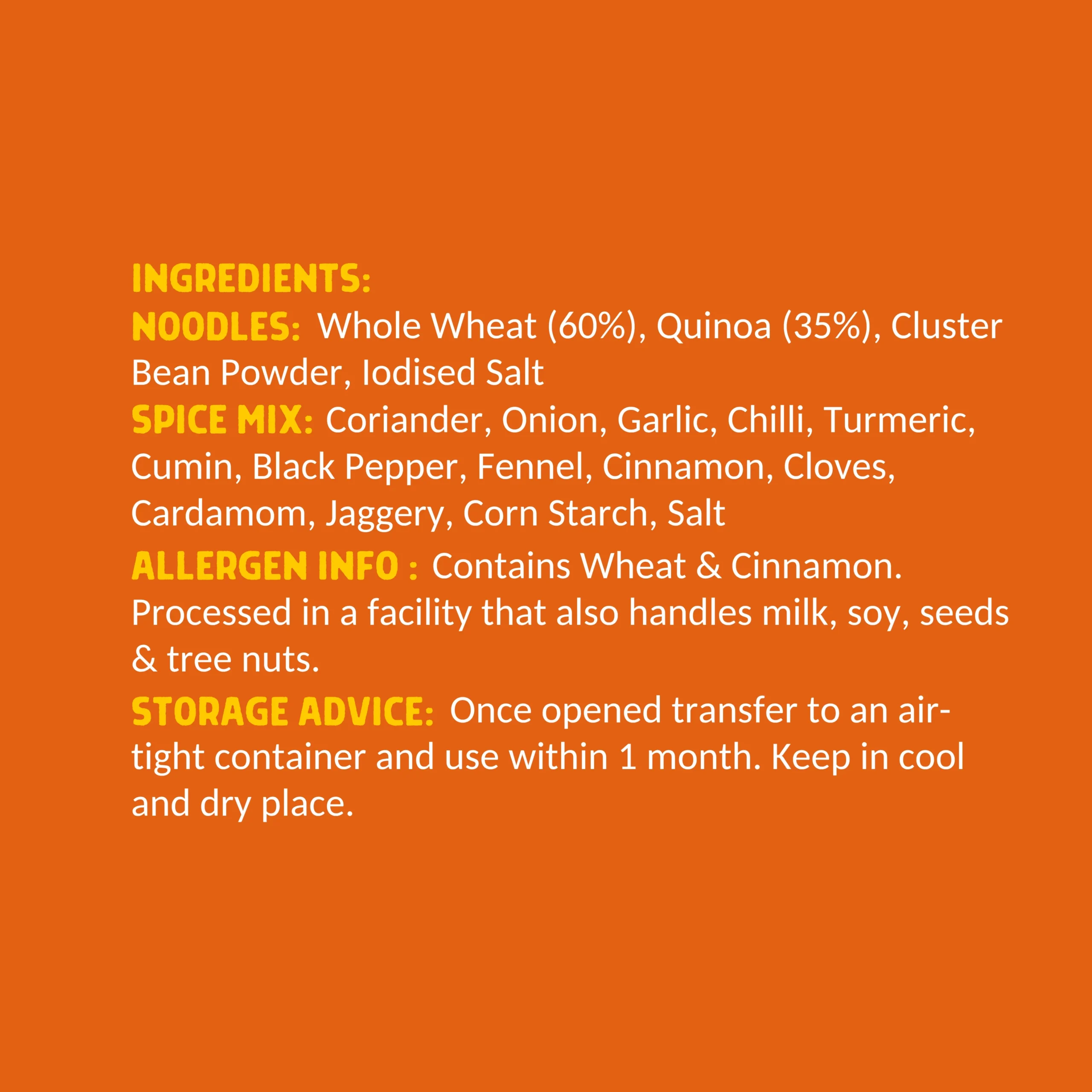 NOODLES: Whole Wheat (60%), Quinoa (35%), Cluster Bean Powder, lodised Salt